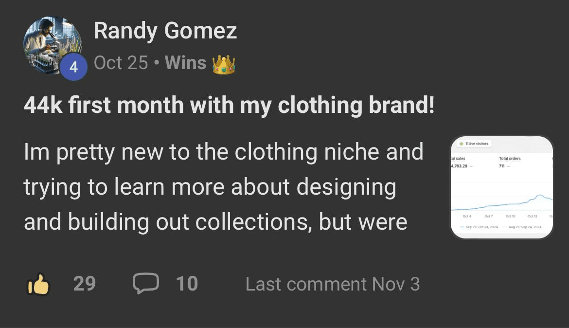 You get 1:1 coaching on the system, processes, marketing, designing, and overall clothing drops so you can grow fast